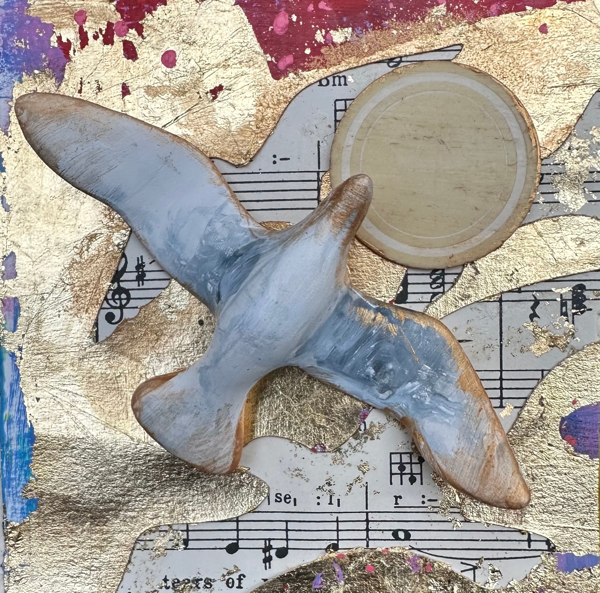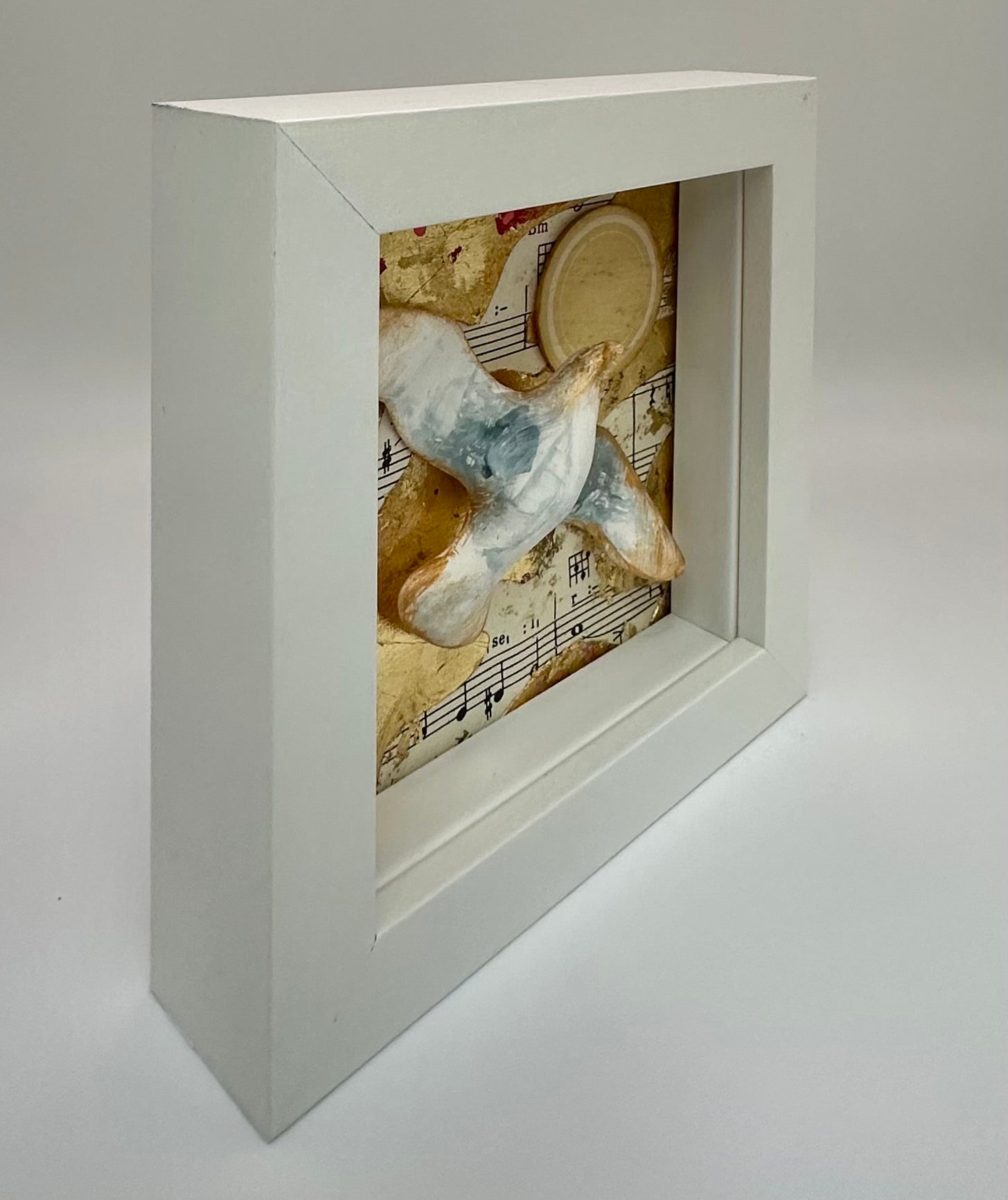 This small original in a white frame can stand alone on a shelf or be hung on a wall. The image consists of 'found' items, collage and gold acrylic paint.