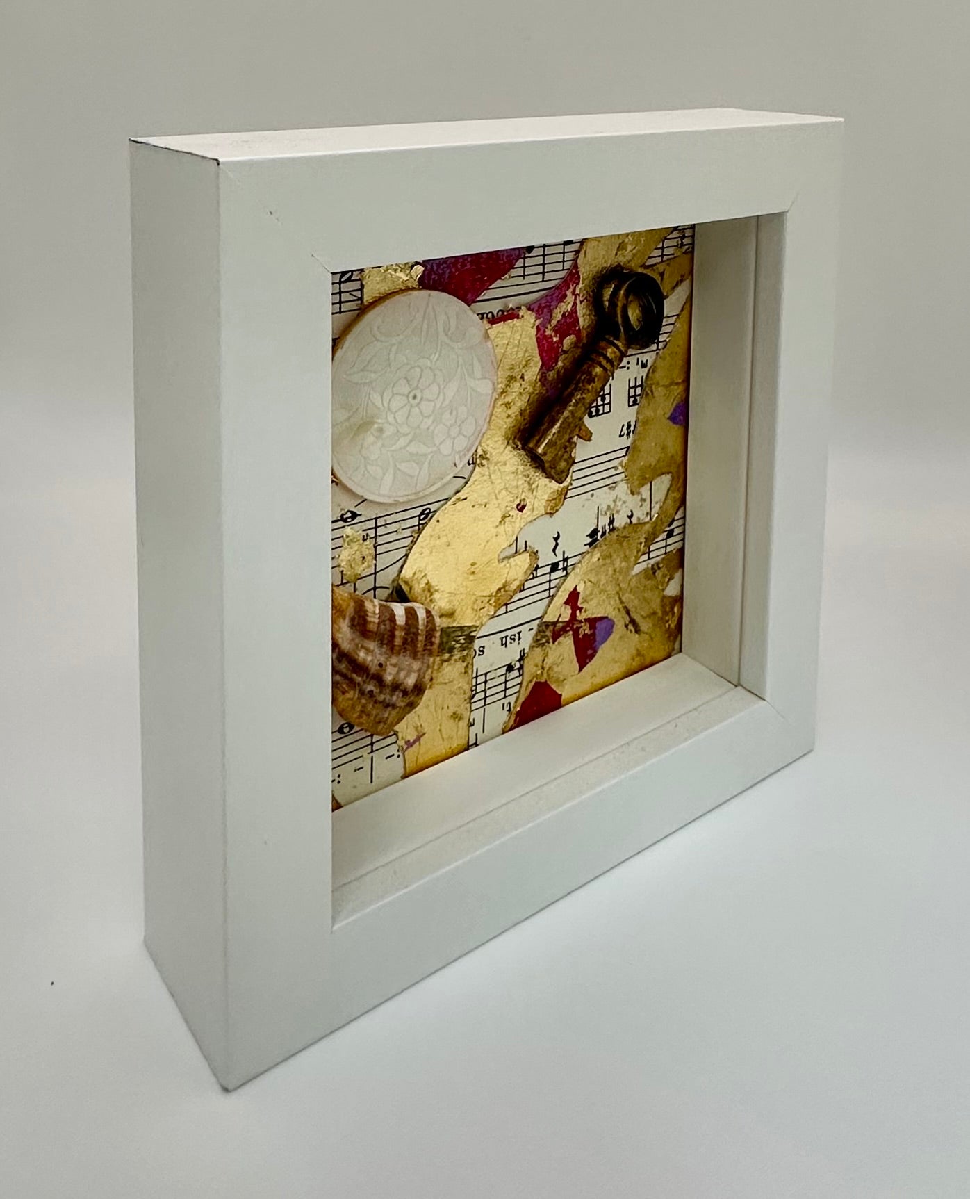 This small original in a white frame can stand alone on a shelf or be hung on a wall. The image consists of 'found' items, collage and gold acrylic paint.