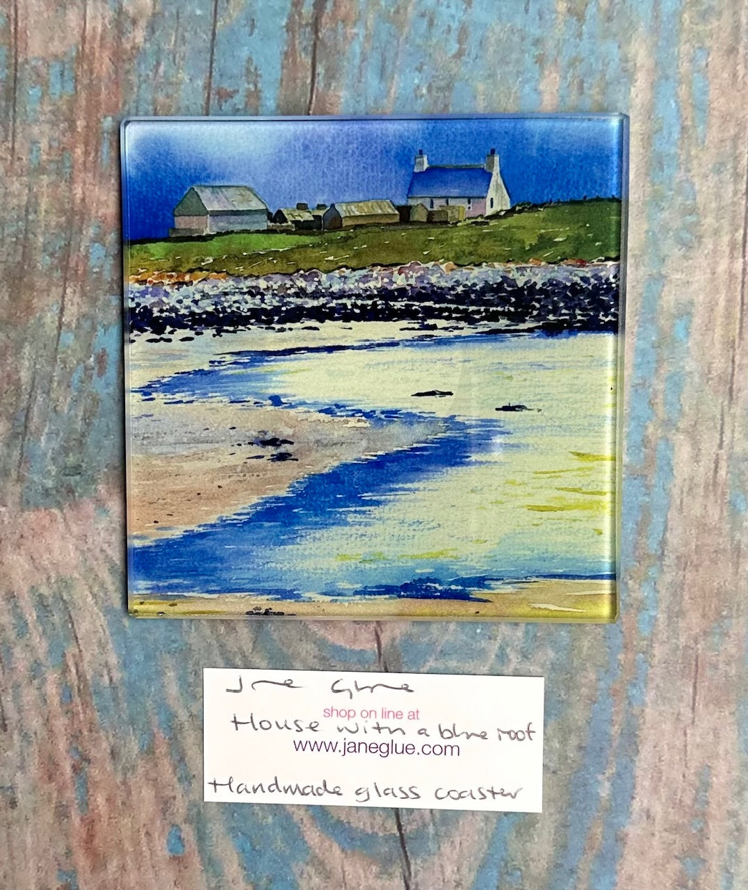 This watercolour picture was painted in Westray. I love the matching colours of the sea and the roof on the house.