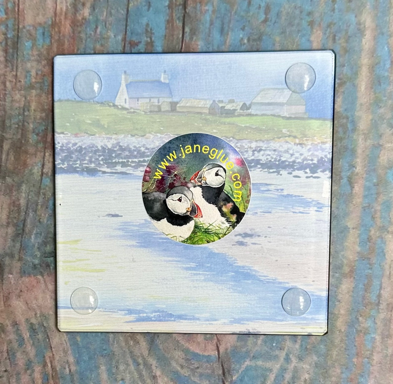 A glass coaster printed with a design from an original mixed media painting by Orkney artist Jane Glue