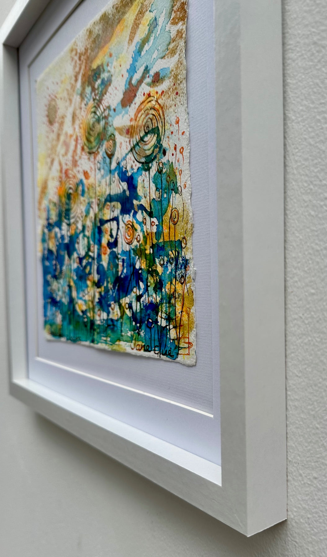 Overall framed size 325X325mm. Framed in a white wood moulding 15X20mm deep, glazed with perspex and mounted with a 20mm wide ivory mount.