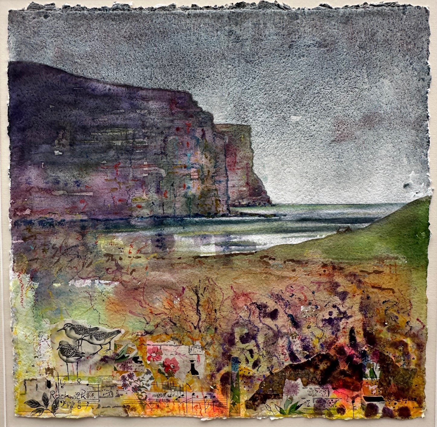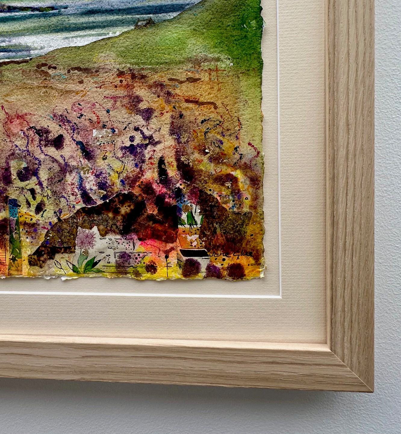 This original image is painted on a heavy deckled edge 300LB weight handmade watercolour paper. I have left the deckled edge exposed around the picture when framing as I think it adds to the finished piece. Rackwick bay on the island of Hoy is one of my favourite places in Orkney. The high cliffs are full of the colours of pink sandstone combined with grass and dominate the horizon. Shades of turquiose blue fill the bay and the uncultivated valley of wild fauna is a haven for all kinds of wildlife. I have used watercolours to initially paint this image on location. The painting was then finished with added collage and brown ink here at my studio in Kirkwall.